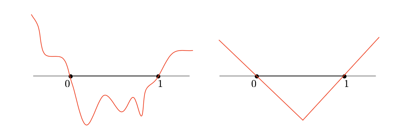 Fig. 2.14 Two different Level Set functions for the interval \(\Omega = (0,1)\) in \(\R\). The signed distance function \(d_\Omega\) (on the right) has unit derivative wherever it is defined.¶