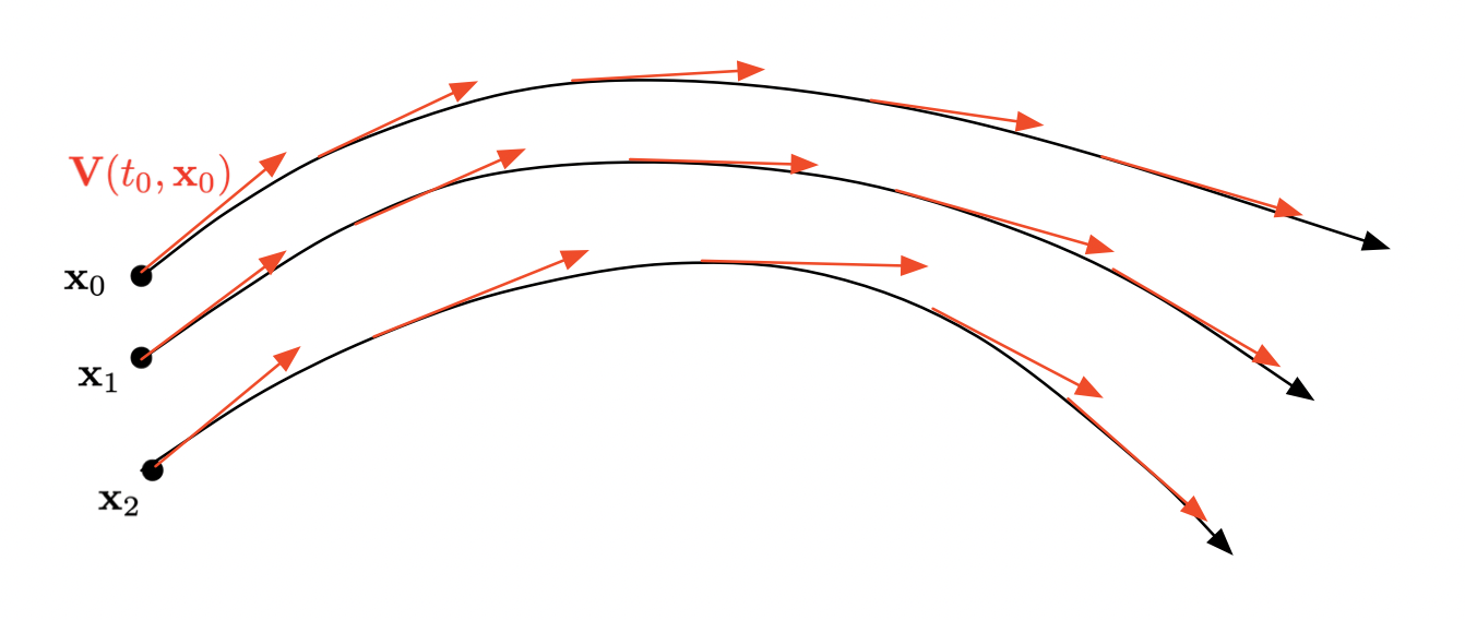 Fig. 2.16 Characteristic curves of the vector field \(\bV(t,\x)\) emerging from 3 different points \(\x_0\), \(\x_1\), \(\x_2\).¶