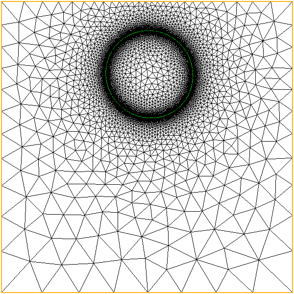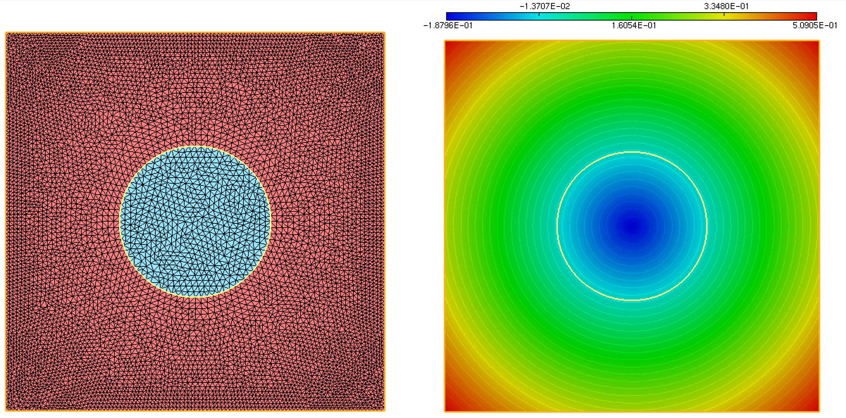 Let us now consider the situation where \(\Omega\) arises as a submesh of a mesh \(\calT\) of the computational domain \(D\), i.e. it is identified as the set of triangles bearing a particular label \(\texttt{REFINT}\), see Fig. 2.15 (left). The following commands can then be used, which make use of the built-in function distance
