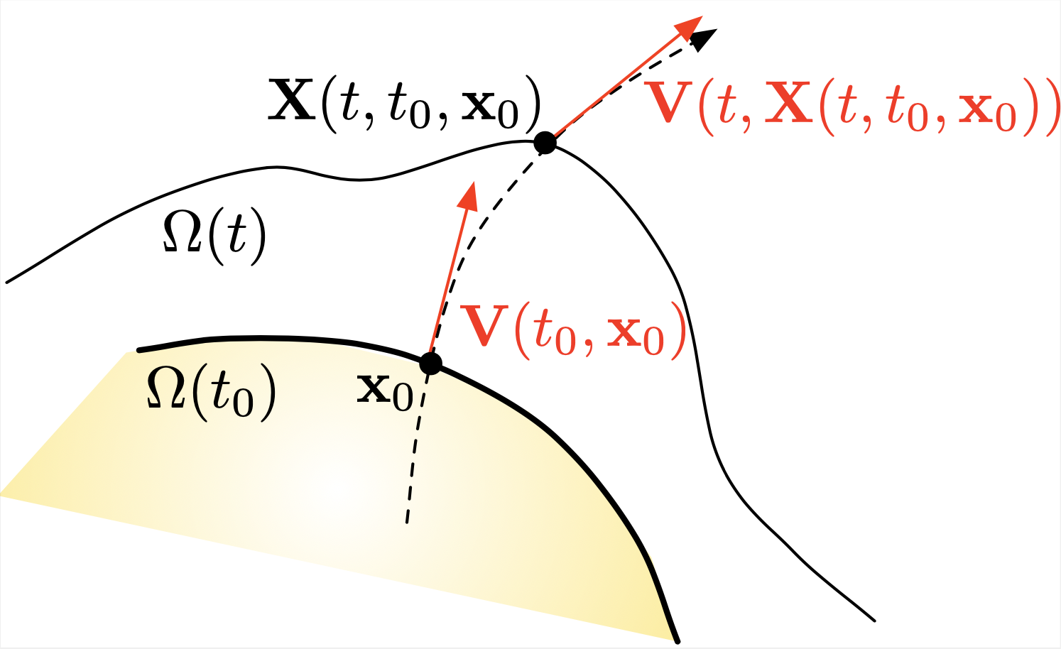 We can now define an evolving domain \(\Omega(t)\) from an initial position \(\Omega(t_0)\) as the set of positions at time \(t\) of the particles lying in \(\Omega(t_0)\) at \(t_0\), see Fig. 2.17