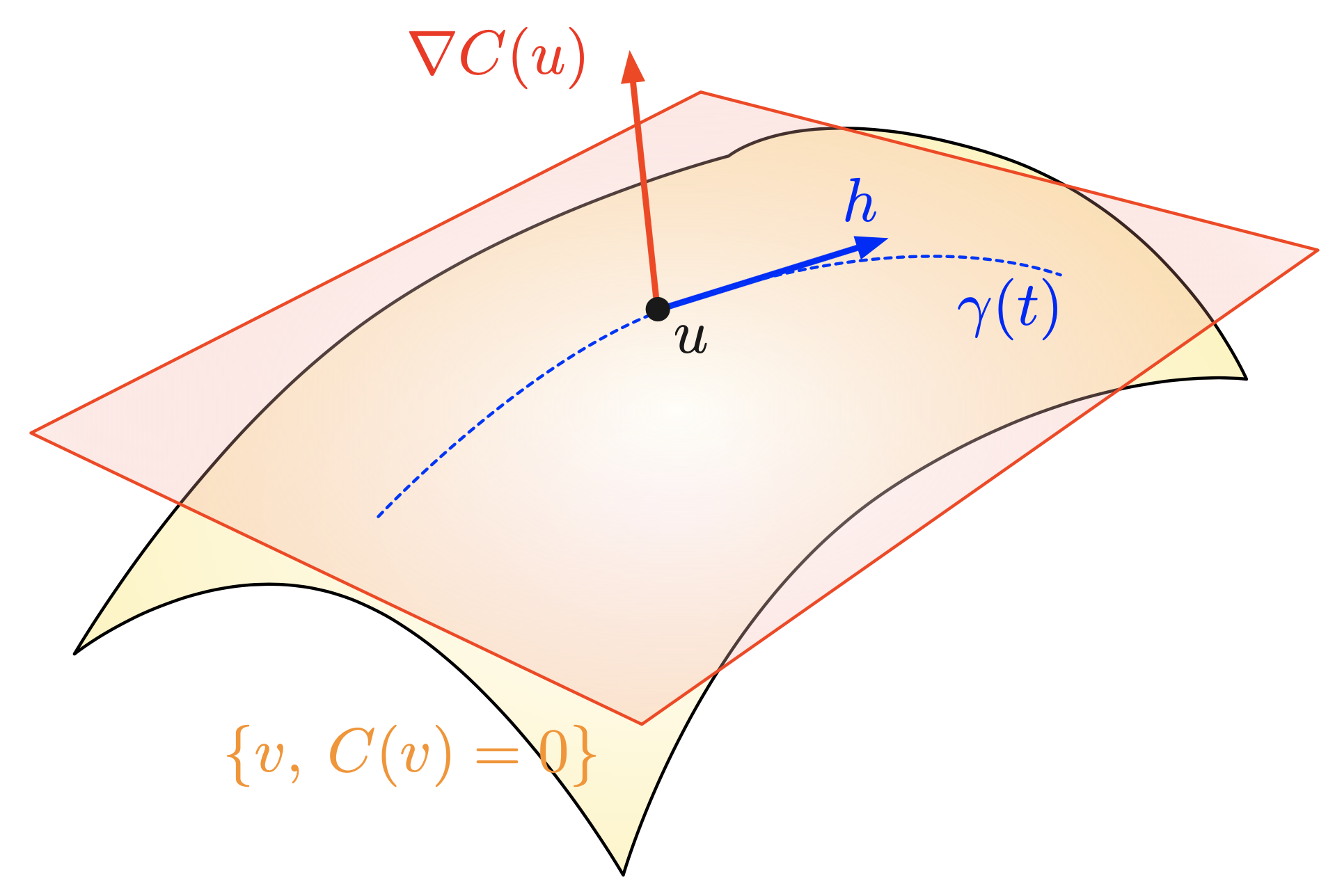 \[K(u) := \left\{ h \in H, \:\: \text{there exists } \varepsilon >0 \text{ and a curve }\gamma: [-\varepsilon,\varepsilon] \to H \text{ s.t. } \gamma(0) = u, \: \gamma^\prime(0) = h \text{ and } C(\gamma(t) ) = 0 \text{ for } t >0 \right\}.\]