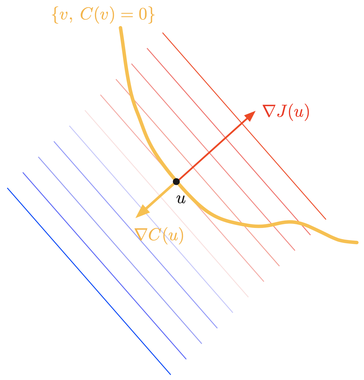 Fig. 6.8 Illustration when \(H= \R^2\), \(p=1\) and \(J\) is an affine function, whose isolines are depicted. At a local optimum \(u\), \(\nabla J(u)\) and \(\nabla C(u)\) are aligned¶