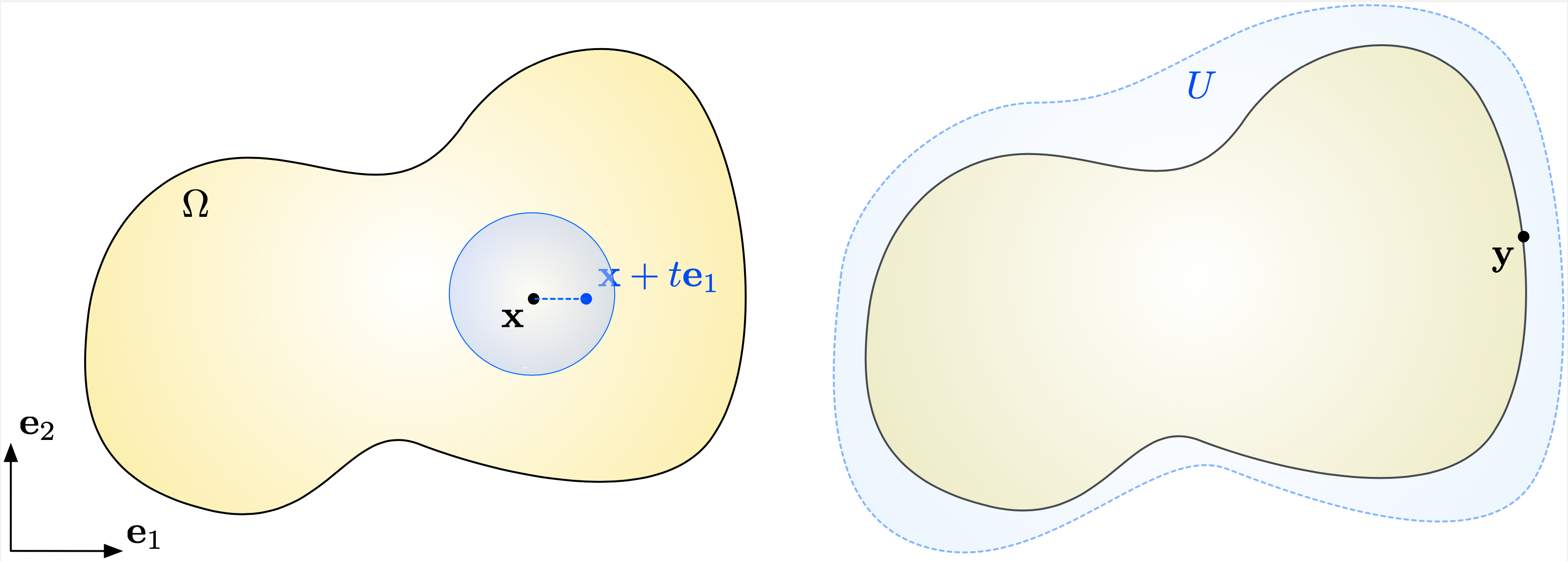 Fig. 1.2 (Left) The definition of the partial derivatives of \(u\) at \(\x\) require that \(u\) be defined on a small neighborhood around \(\x\); (right) The derivative of \(u\) at a boundary point \(y \in \partial \Omega\) involves an extension of \(u\) to a slightly larger open set \(U\).¶