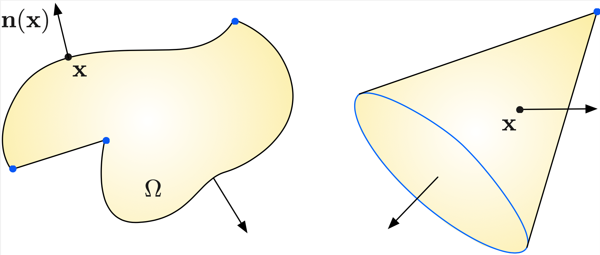 Fig. 1.1 (Left) The boundary of a 2d Lipschitz domain is a smooth curve, except at some vertices (in blue); (right) The boundary of a 3d Lipschitz domain is a smooth hypersurface, except at corners (blue points) and ridges (blue lines)¶
