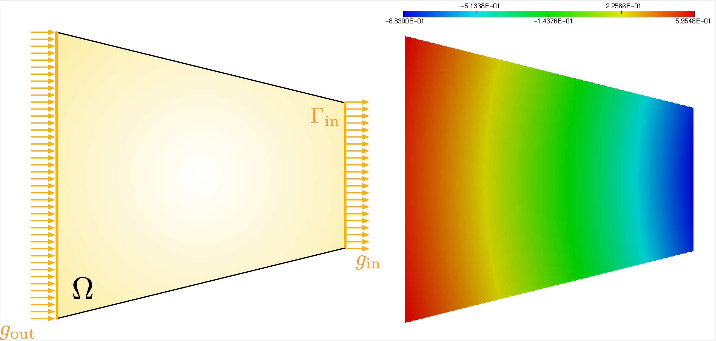 Fig. 1.24 Resolution of the pure Neumann problem (1.33); (Left) Setting of the test-case: heat is entering \(\Omega\) from the left boundary \(\Gamma_{\text{in}}\) with a flux \(g_{\text{in}}\) and is leaving \(\Omega\) from the right boundary \(\Gamma_{\text{out}}\) with a flux \(g_{\text{out}}\); (right) Plot of the solution.¶