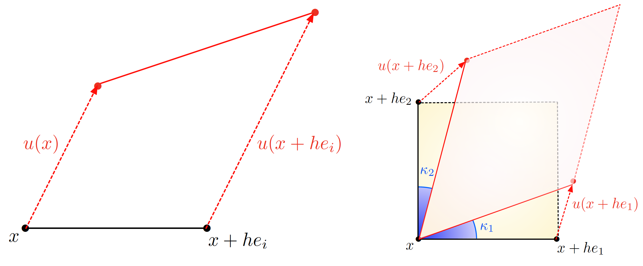 \[\lvert x + he_i + u(x+he_i) - (x+u(x)) \lvert \approx h + h e(u)(x)_{ii} .\]For \(i,j=1,\ldots,d\), \(i\neq j\), \(e(u)(x)_{ij}\) measures the distortion of angles between the directions \(e_i\) and \(e_j\); more precisely,