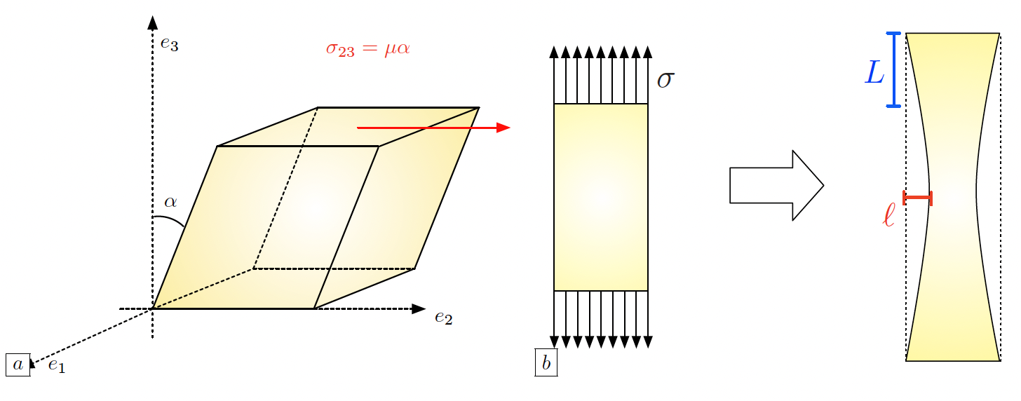 Fig. 3.4 Elastic parameters: (a) The shear modulus \(\mu\) accounts for the force \(\sigma_{23} = \mu \alpha\) that should be applied on the face oriented by \(e_3\) of a piece of material in the transverse direction \(e_2\) to create an angle \(\alpha\) with the \(e_3\) direction; (b) The Young’s modulus \(E = \sigma/L\) accounts for the amplitude of the force \(\sigma\) needed to stretch a piece of material by a length \(L\); the Poisson’s ratio \(\nu = -\ell / L\) measures the relative transverse displacement in this process.¶