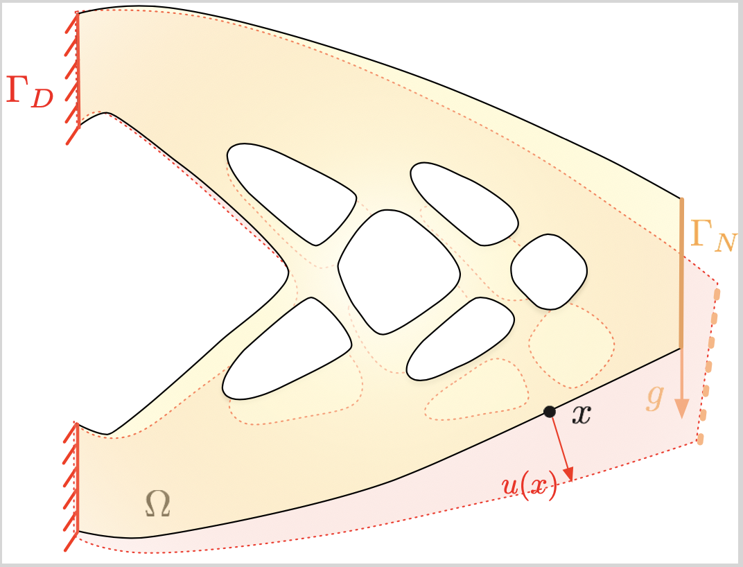 Let \(\Omega \subset \R^d\) be a structure which is attached on a region \(\Gamma_D\) of its boundary; it is submitted to body forces \(\textbf{f} : \Omega \to \R^d\) and surface loads \(\textbf{g} : \Gamma_N \to \R^d,\) applied on a region \(\Gamma_N\) of \(\partial \Omega\) disjoint from \(\Gamma_D\). The displacement \(\u\) of \(\Omega\) is the solution to the following system: