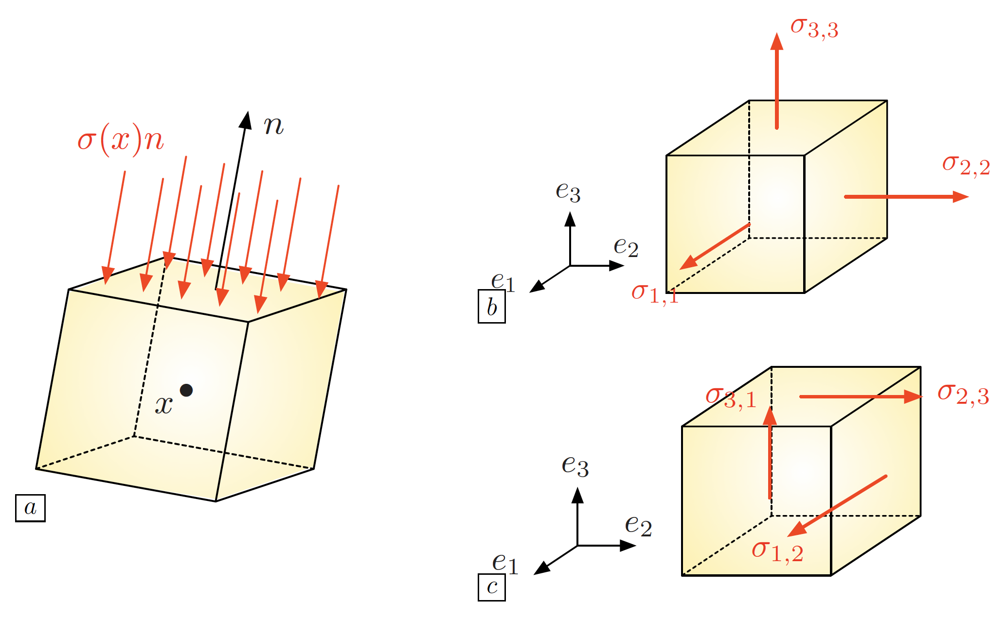 This task involves Cauchy’s stress tensor \(\sigma : \Omega \to \mathbb{R}^{d \times d}\): for any point \(x \in \Omega\) and any unit vector \(n \in \mathbb{S}^{d-1}\), \(\sigma(x) n\) is the force applied by the outer medium on the face of an infinitesimally small cube of material around \(x\), see Fig. 3.3. The entries of the tensor \(\sigma(x)\) can be separated between traction-compression entries and shear components, as depicted on Fig. 3.3 (b), (c):