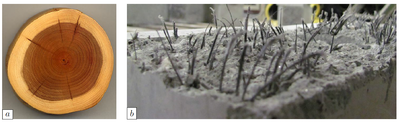Fig. 3.5 Two different elastic materials: (a) Wood is an orthotropic material with large stiffness in the direction of the grain, low stiffness in the radial direction, and intermediate stiffness in the azimuthal direction; (b) Fiber-reinforced concrete is a transversely isotropic material: it is much stiffer in the direction of the metallic fibers than in the orthogonal directions.¶